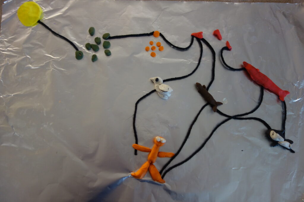 This afternoon, Maurice joined us to help the elementary kids learn about food webs. After some good brainstorming, we made a modeling-clay St. George Island marine food web. It was interesting to see how many species feed on small fish, and how phytoplankton form the important base for these marine food webs. Costin explained what would happen to the fur seals if the fish disappeared.
