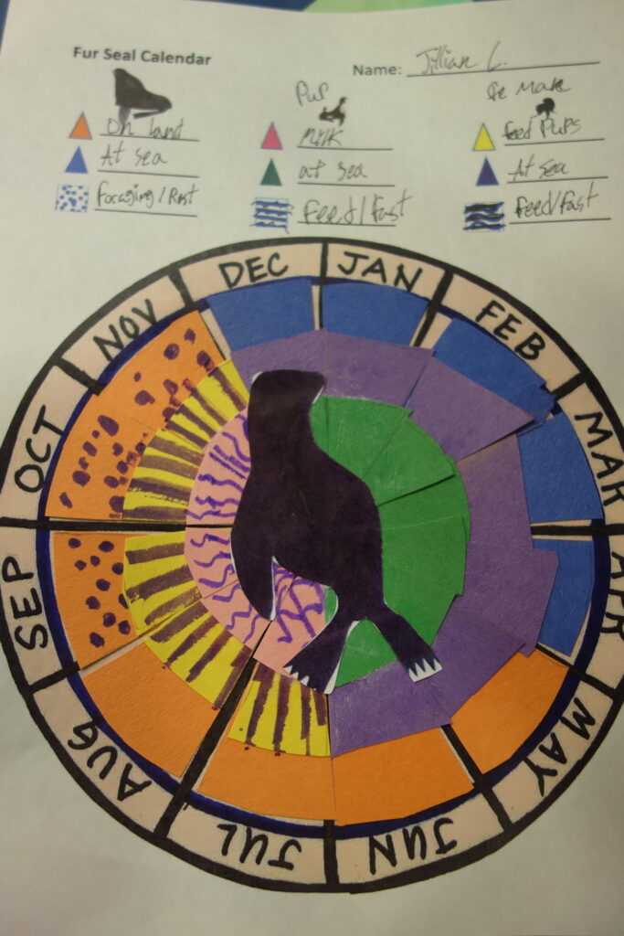 Another very windy day on St. George Island!  After some stretching to wake ourselves up, Jillian, Chipper and I made a circular northern fur seal calendar, learning what adult females, adult males and pups do over the course of a year.  Male fur seals start showing up on the beaches of St. George and St. Paul Island in May, and they don’t go out to sea to feed again until August!  Females arrive later than the males, coming to shore in July and giving birth to their pup within 1-2 days of arriving on the beach.  Males, Females and pups all leave the Islands in November.